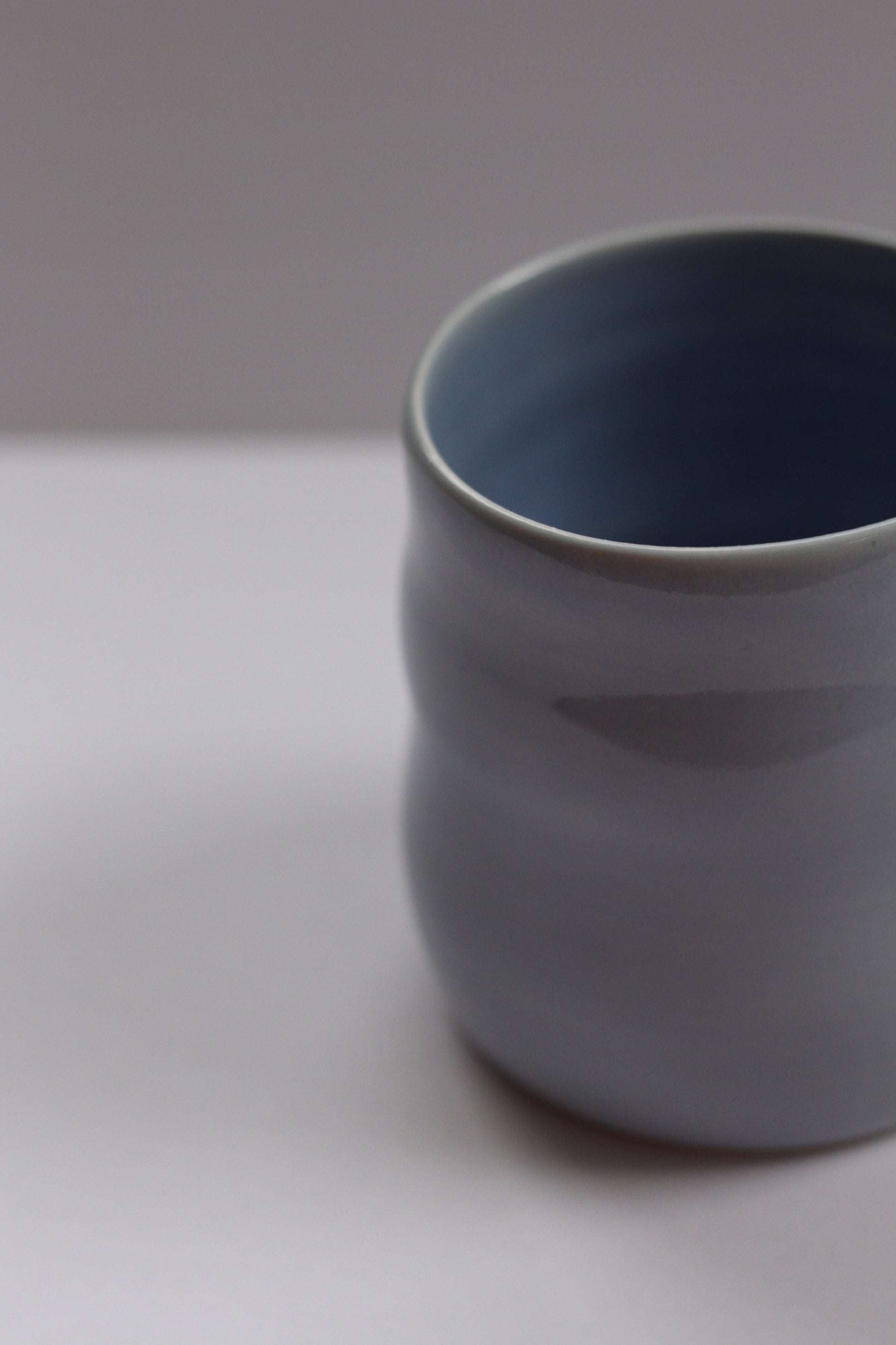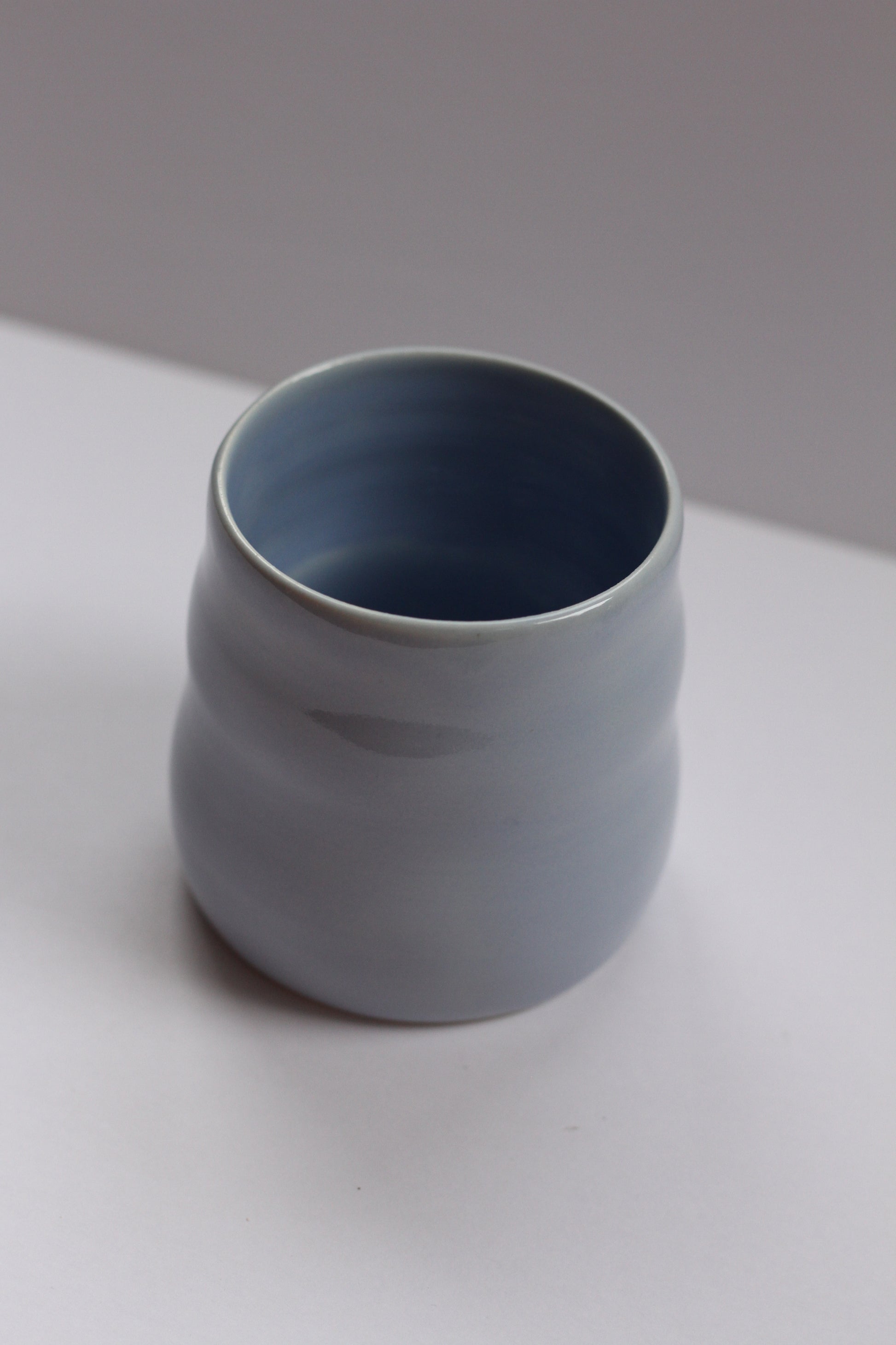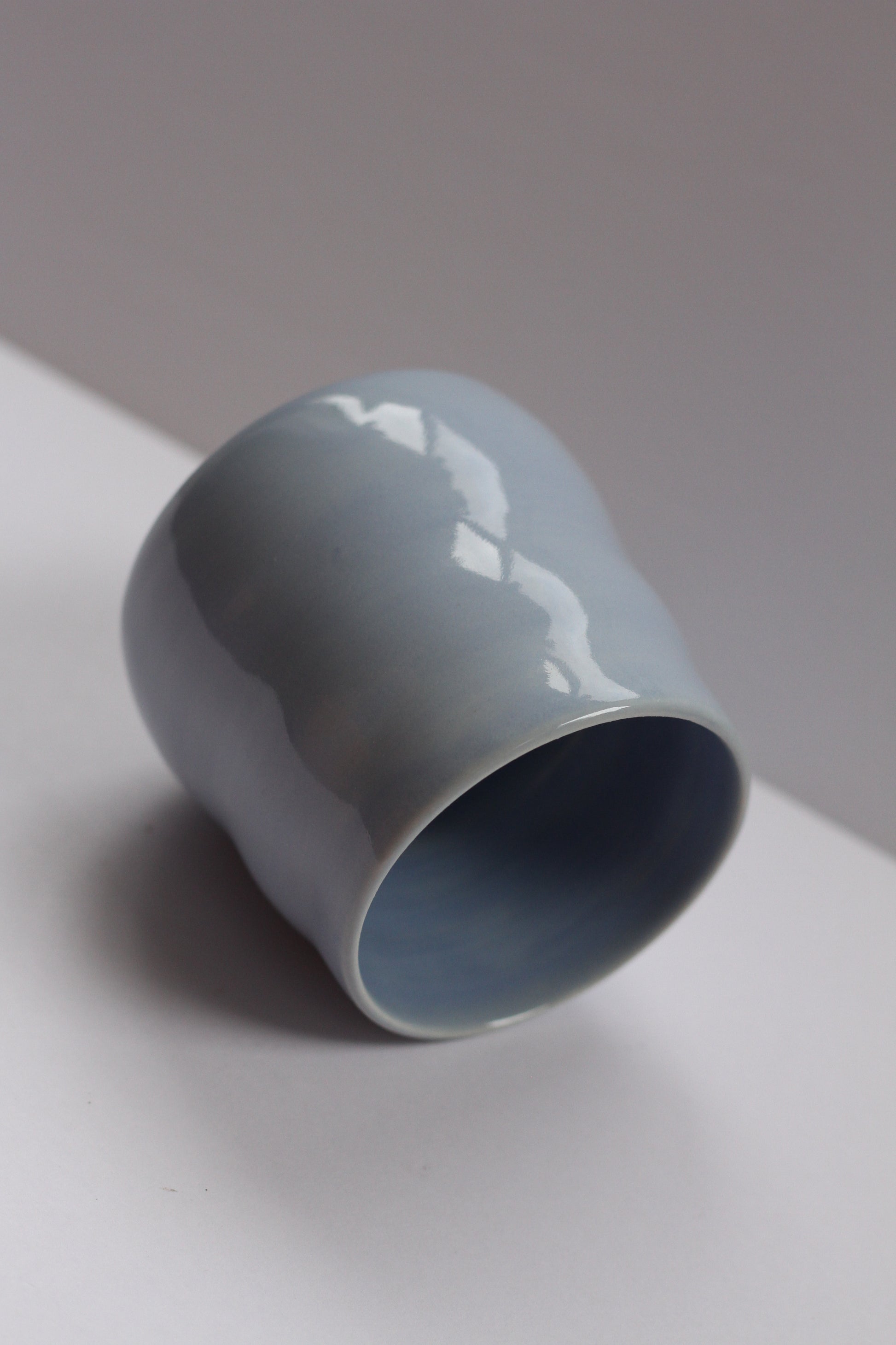 - Cup made with porcelain clay. Shiny light blue colored glaze on the interior and exterior