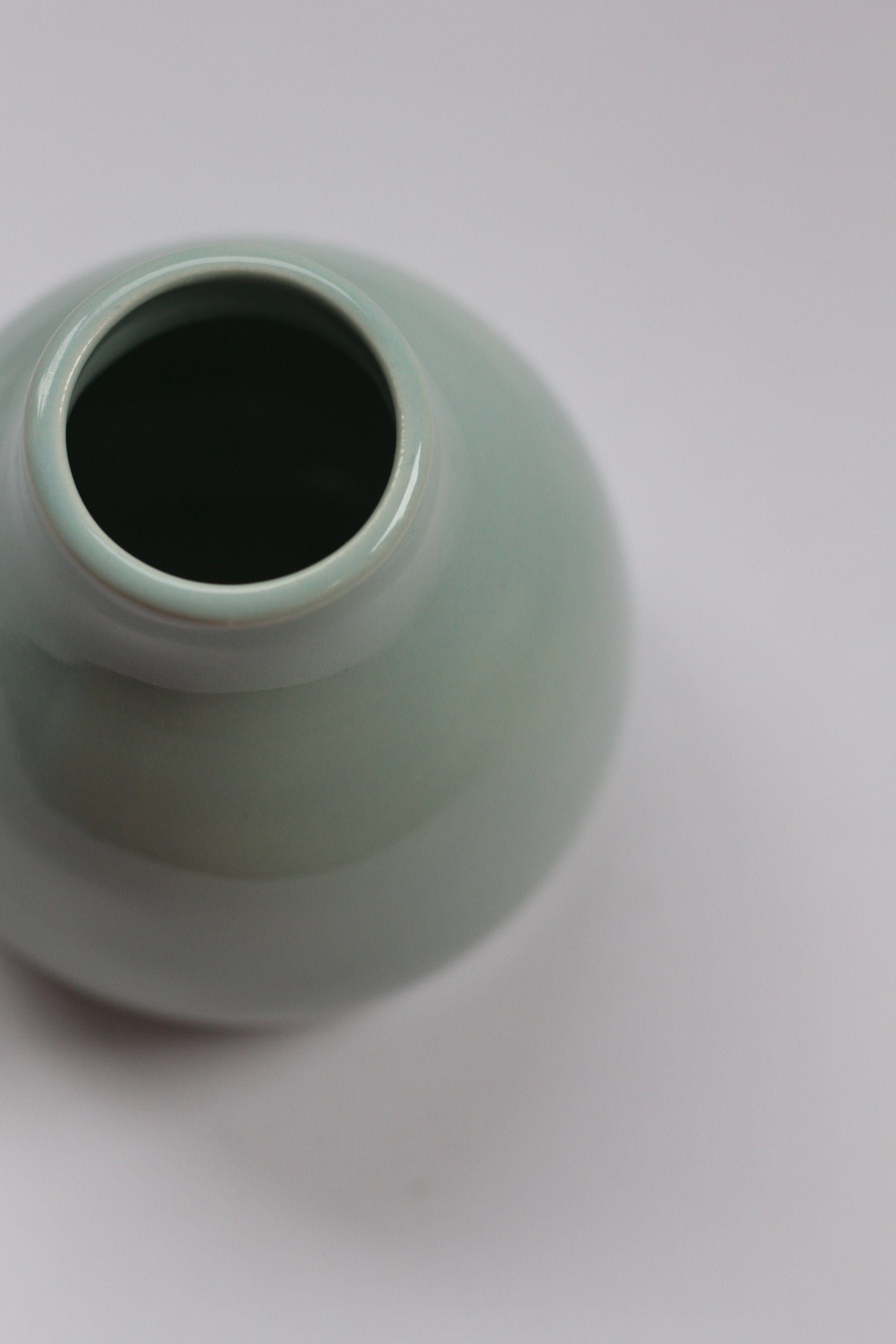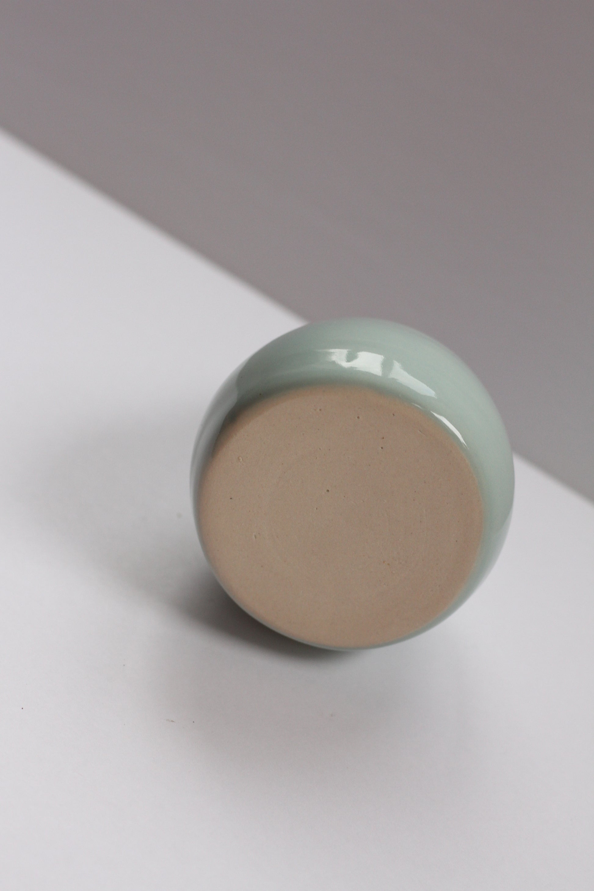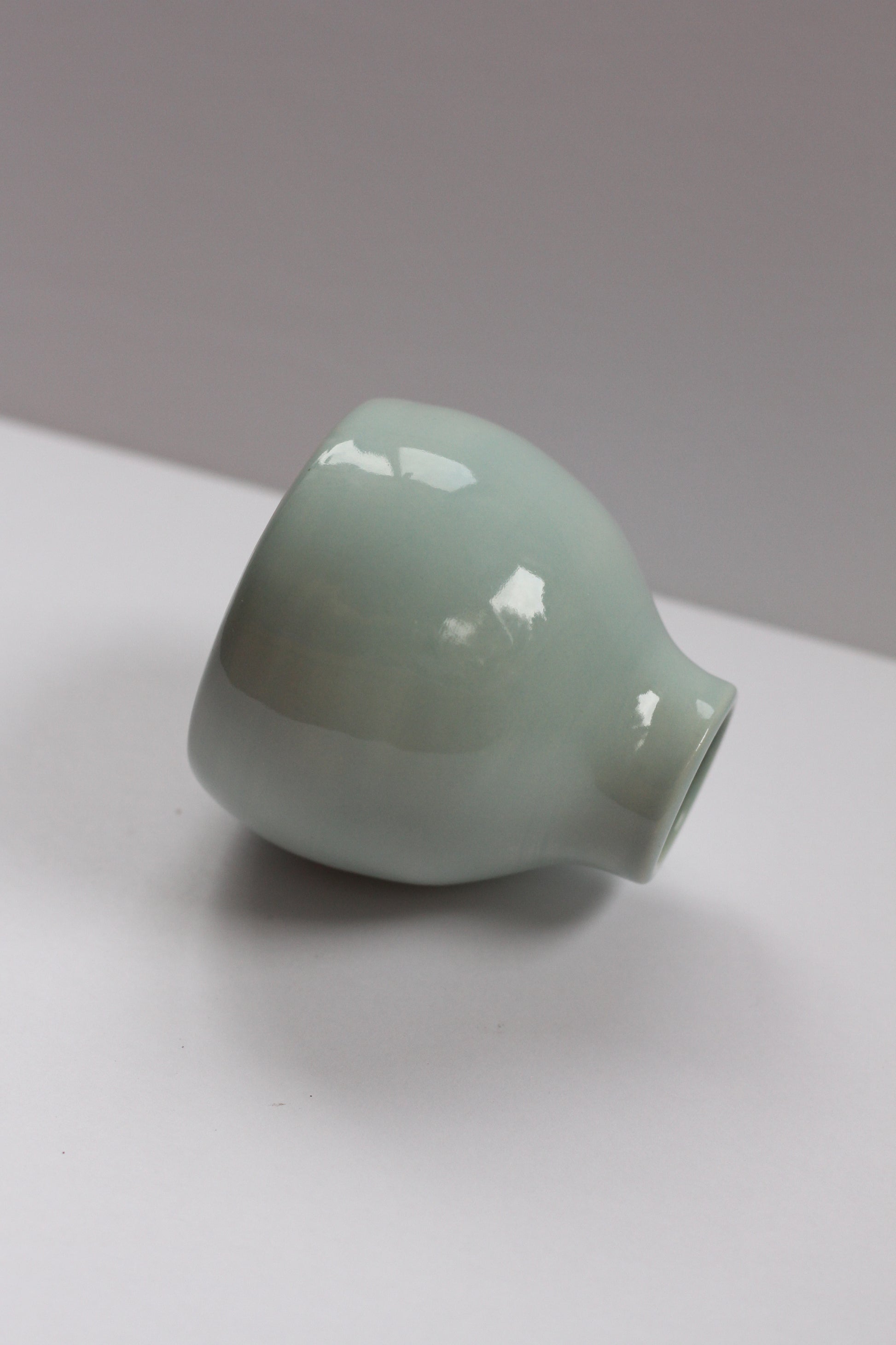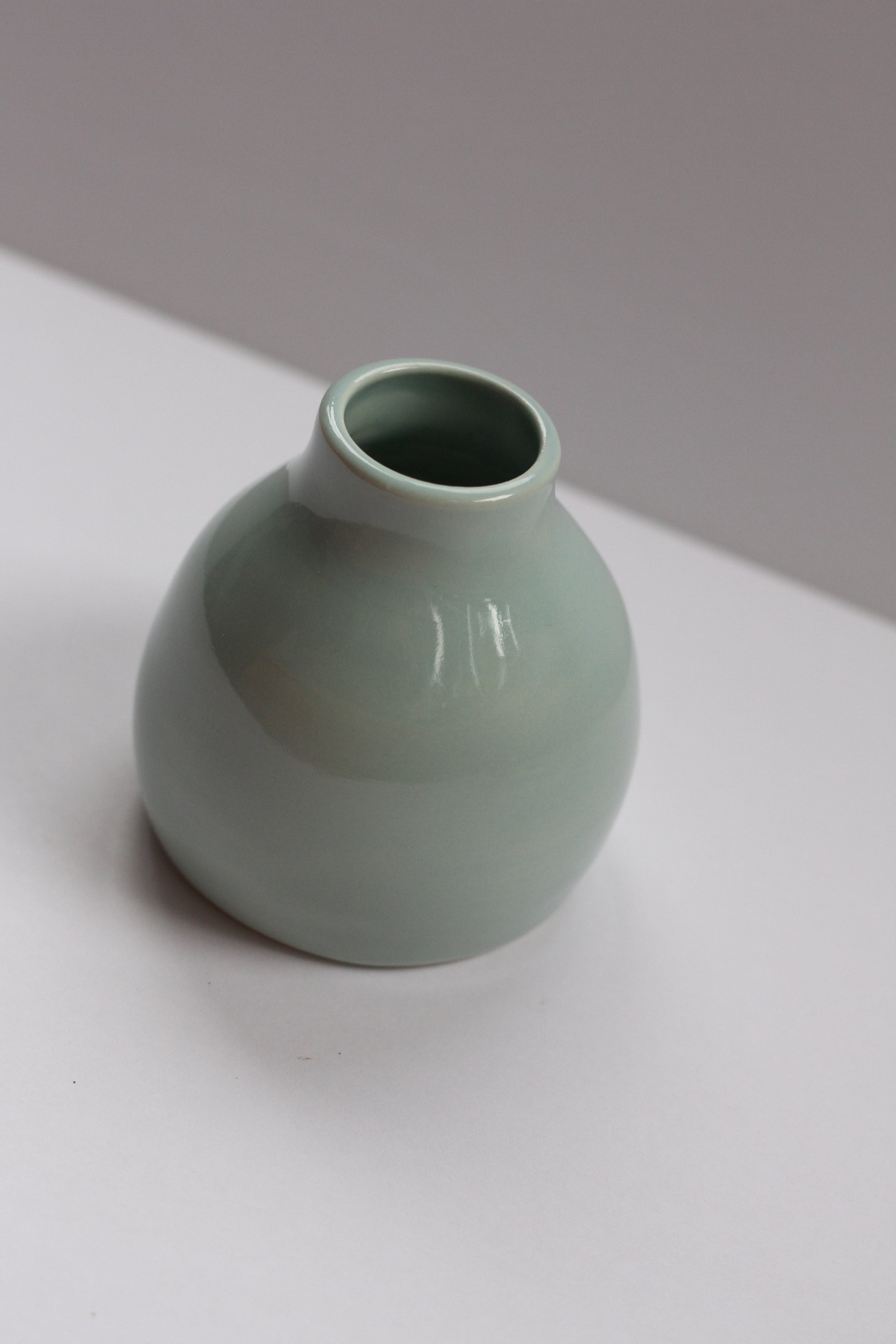 - Bud vase made with porcelain clay. Shiny light blue-green hue colored glaze on the interior and exterior