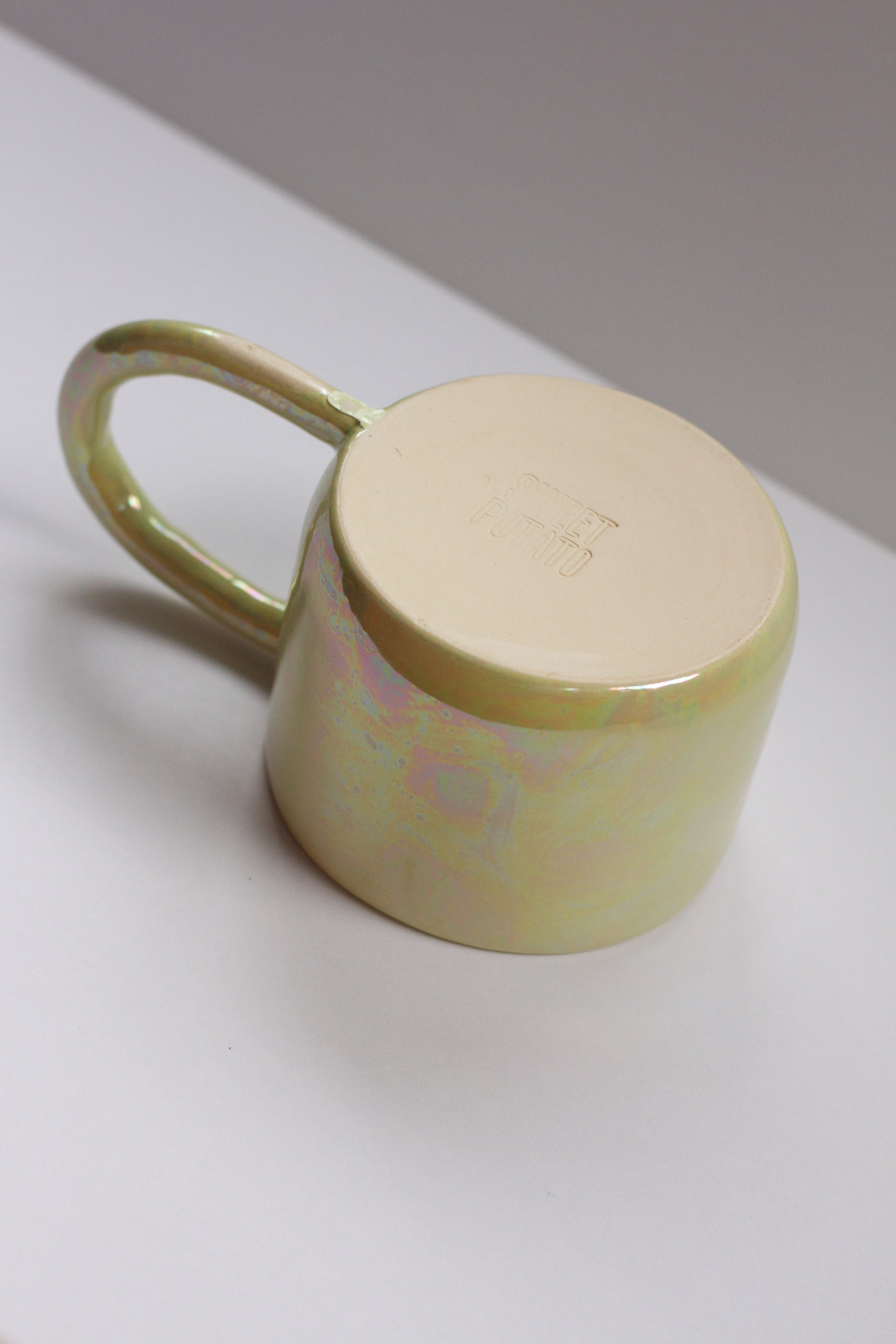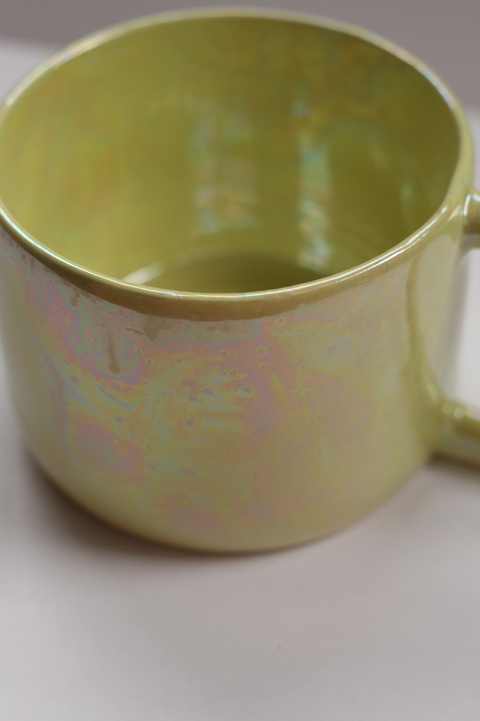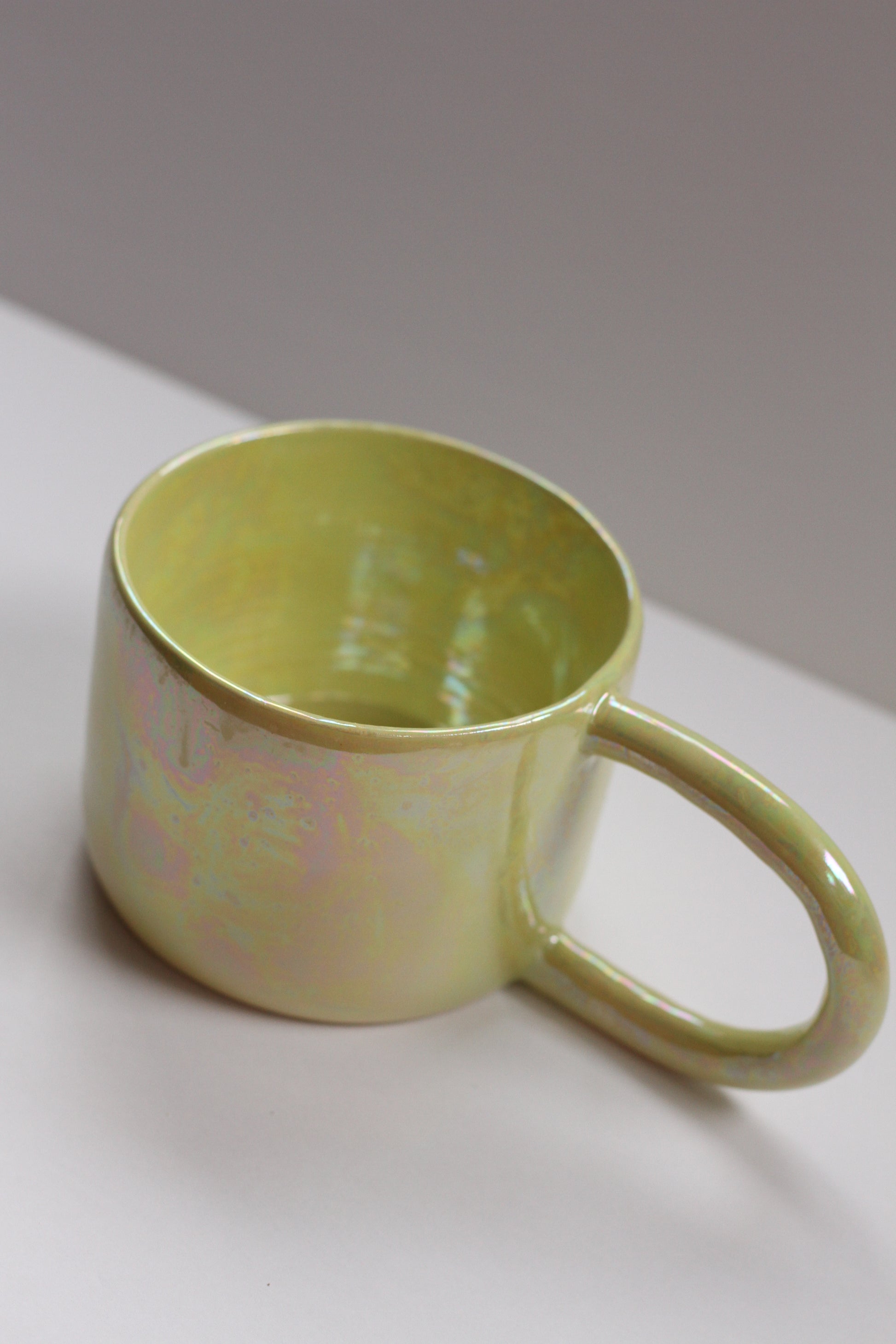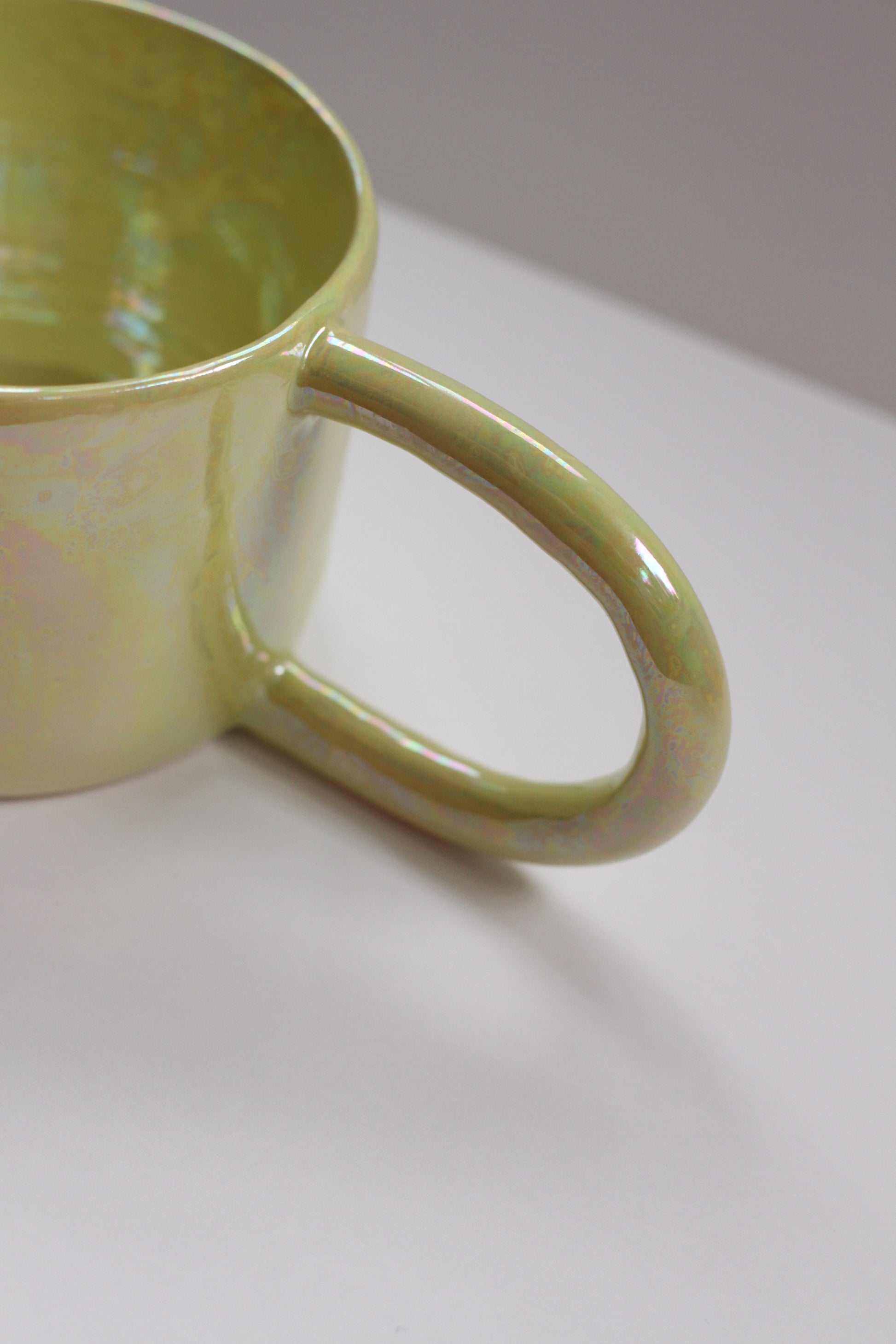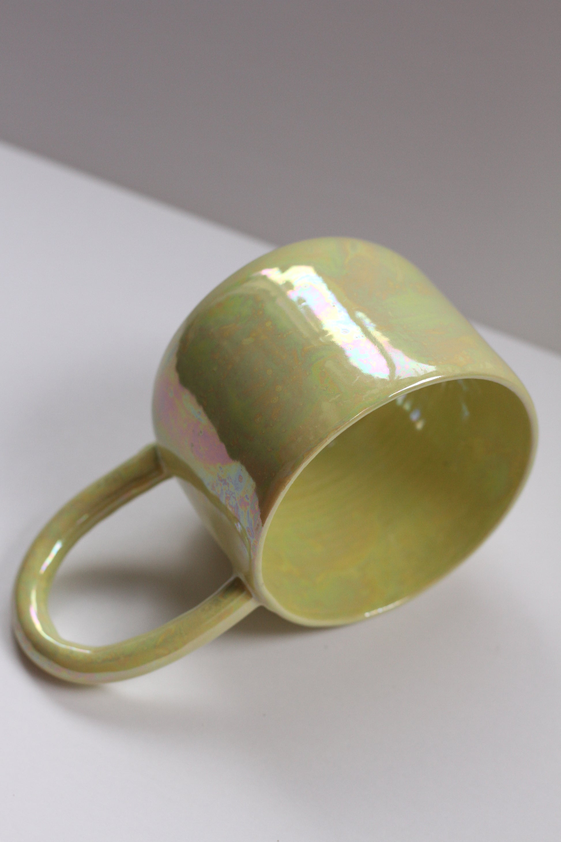 - Mug made with porcelain clay. Shiny honeydew colored glaze on the interior and exterior, and opalescent overglaze on the interior and exterior