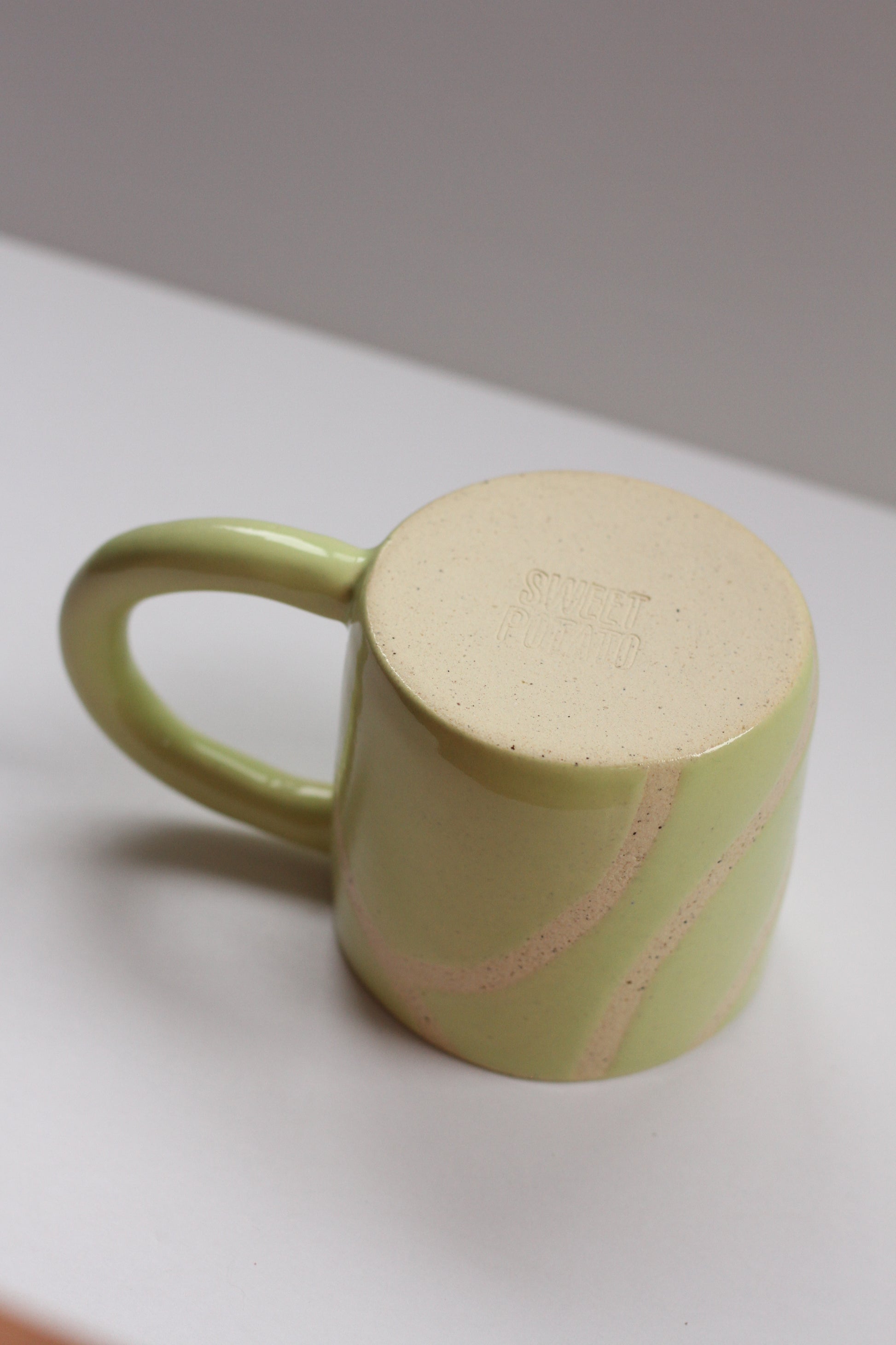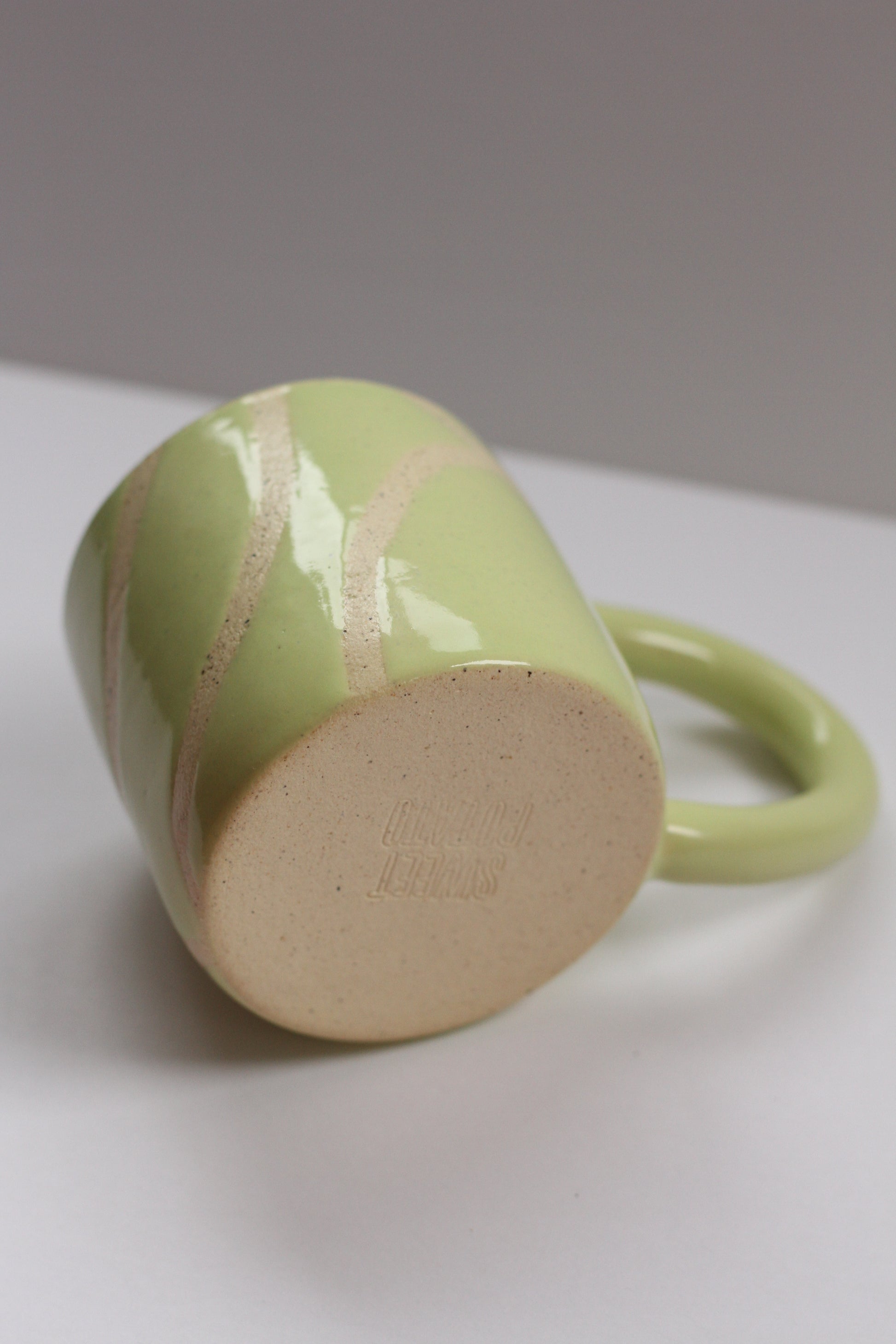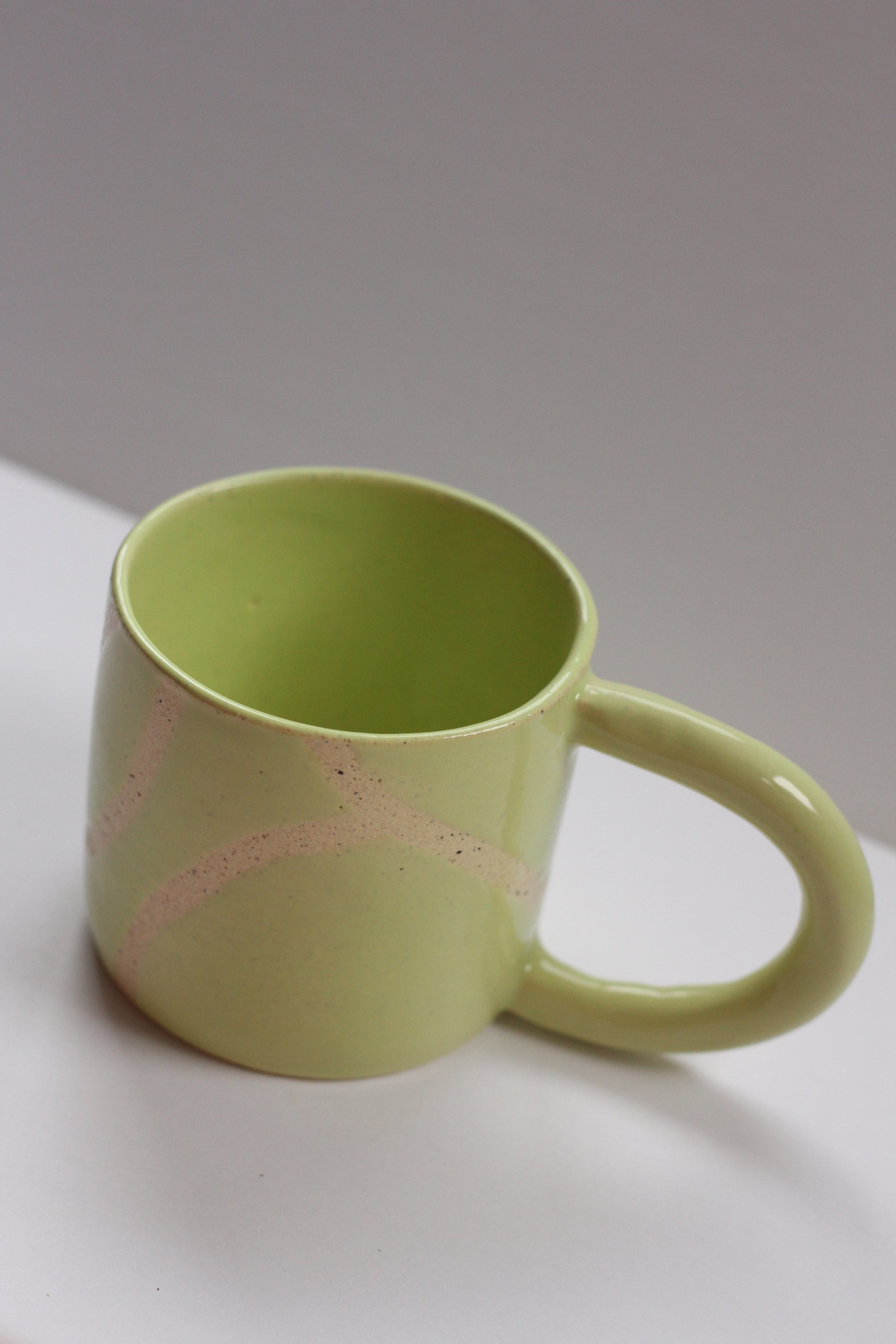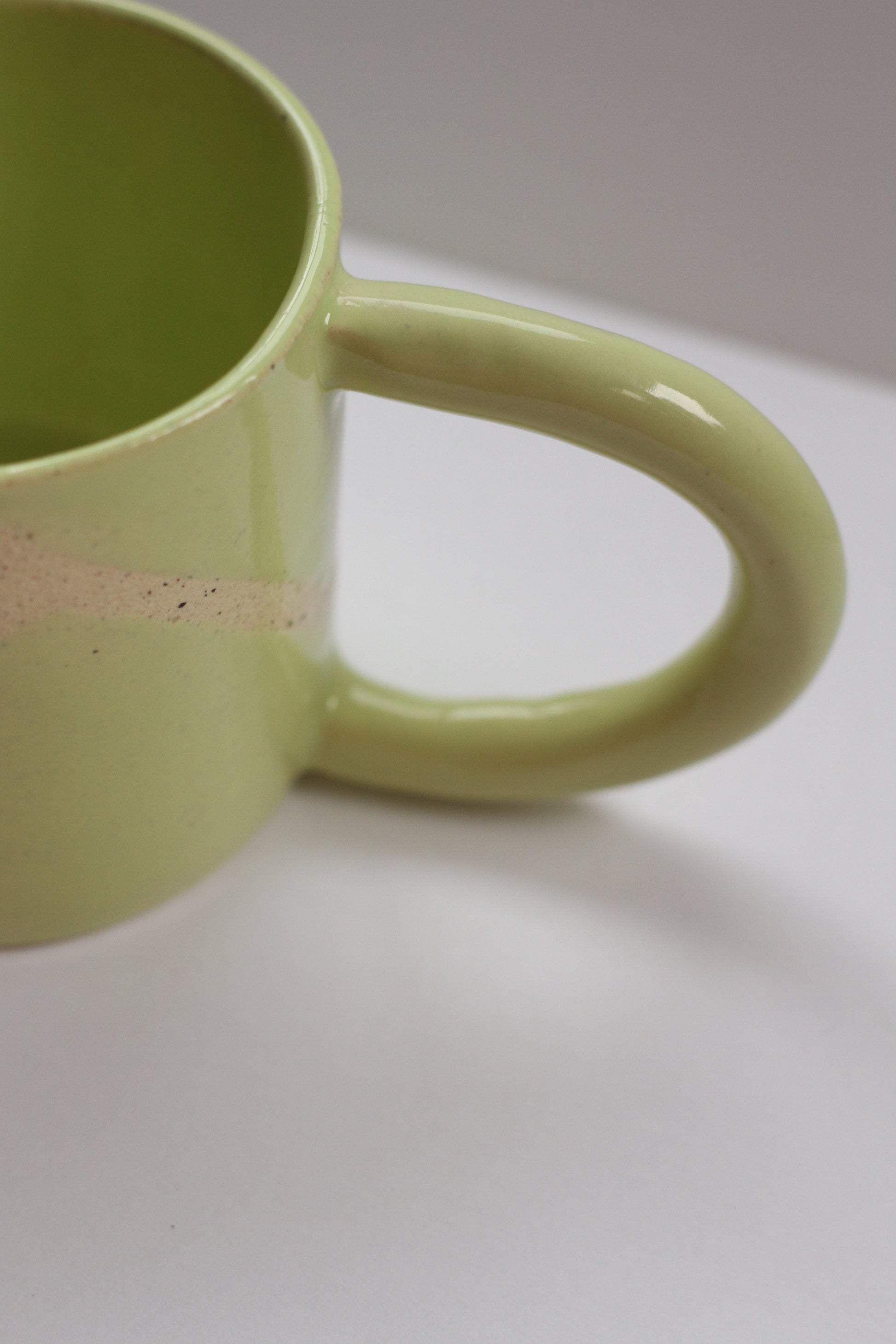 - Mug made with speckled stoneware clay. Shiny honeydew colored glaze on the interior and exterior