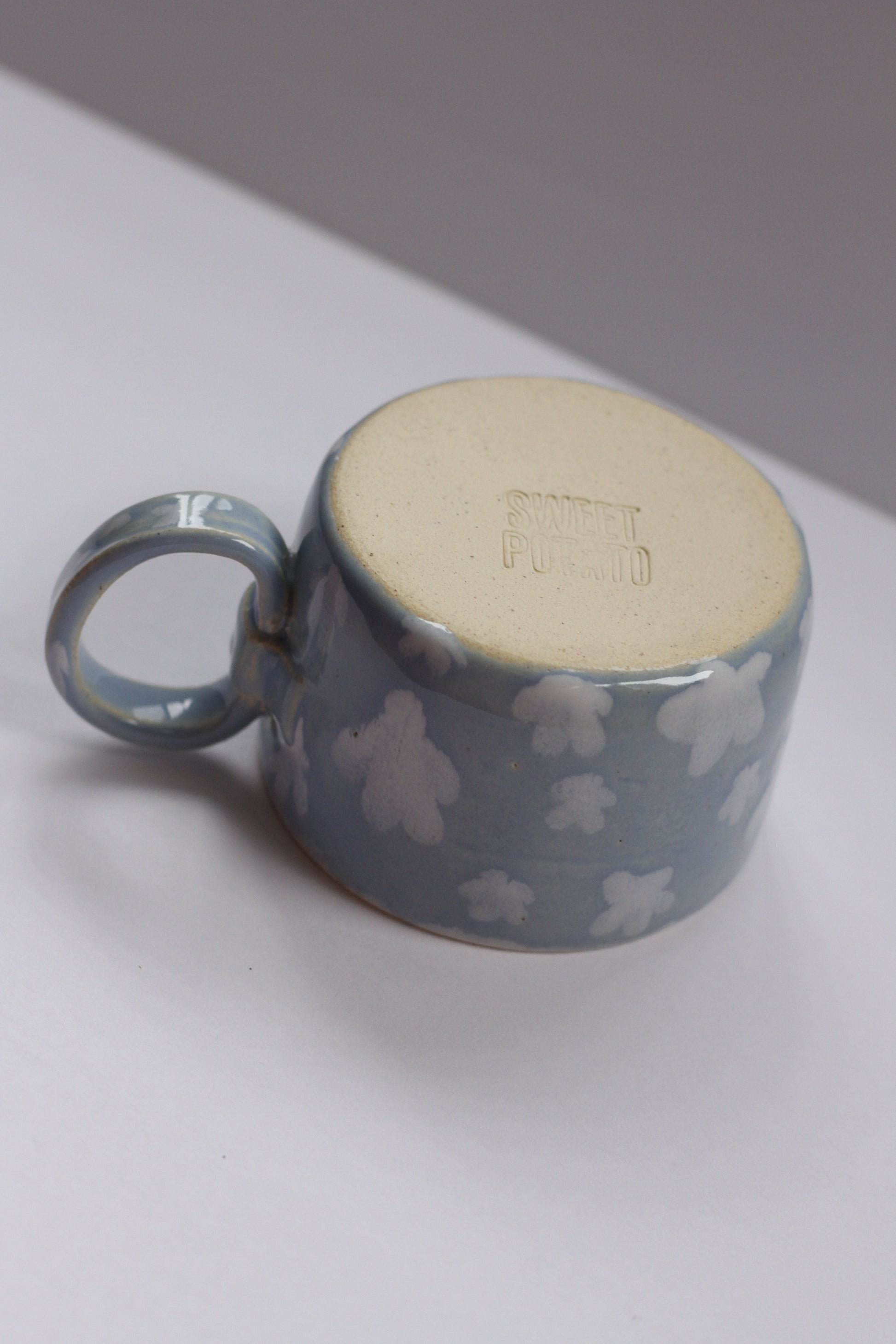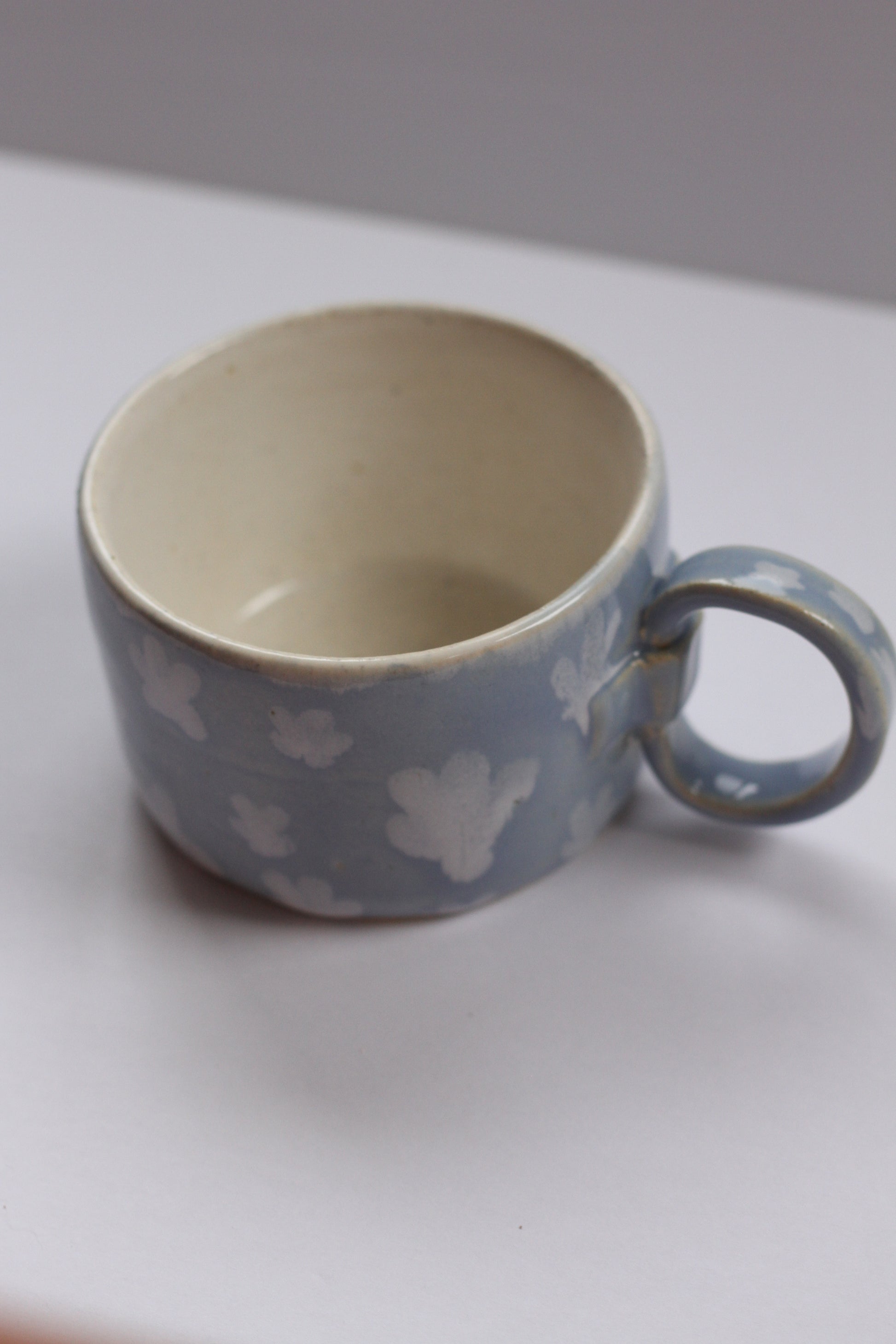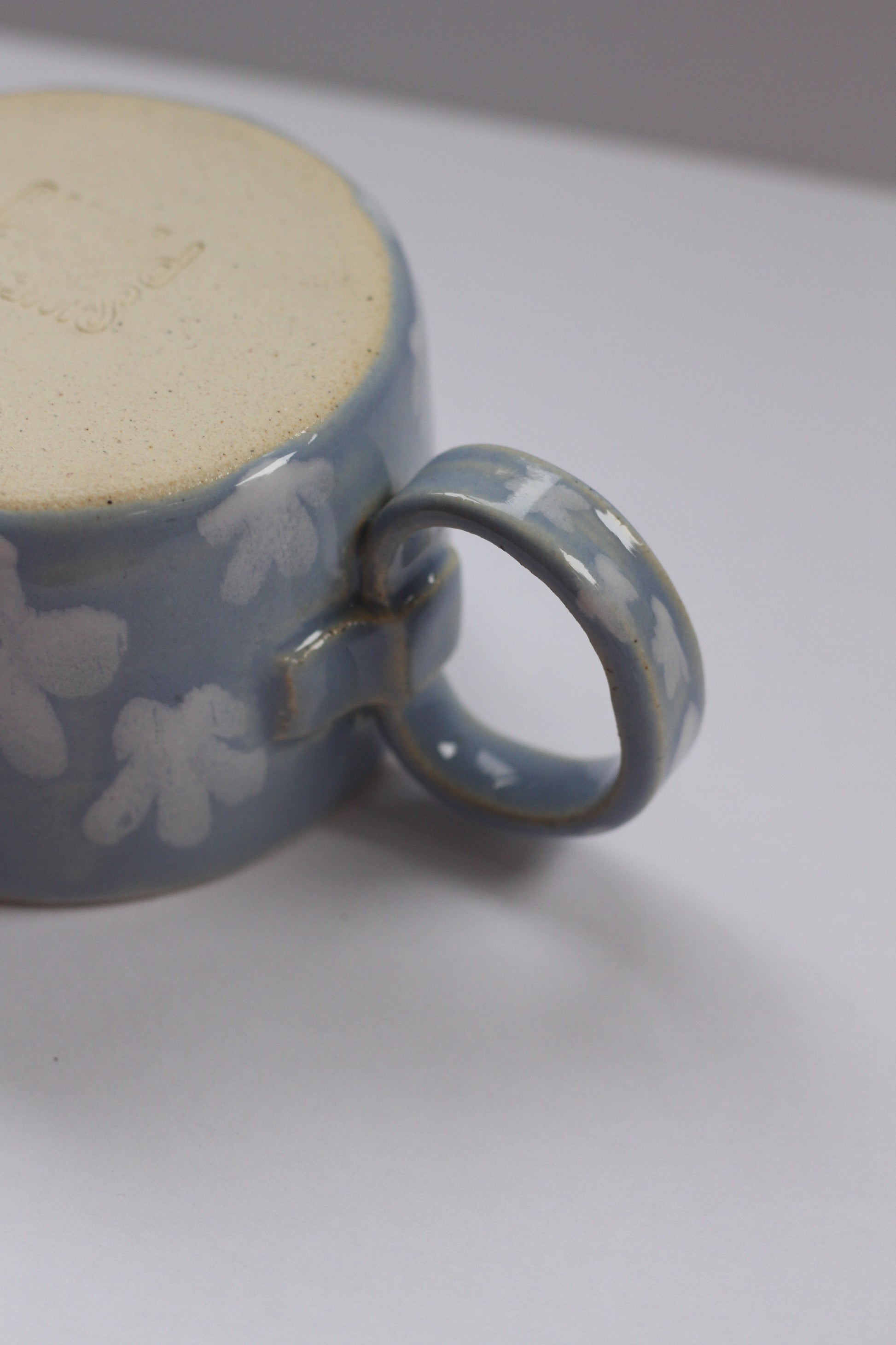 - Mug made with speckled stoneware clay. Shiny light blue and white colored glaze on the interior and exterior