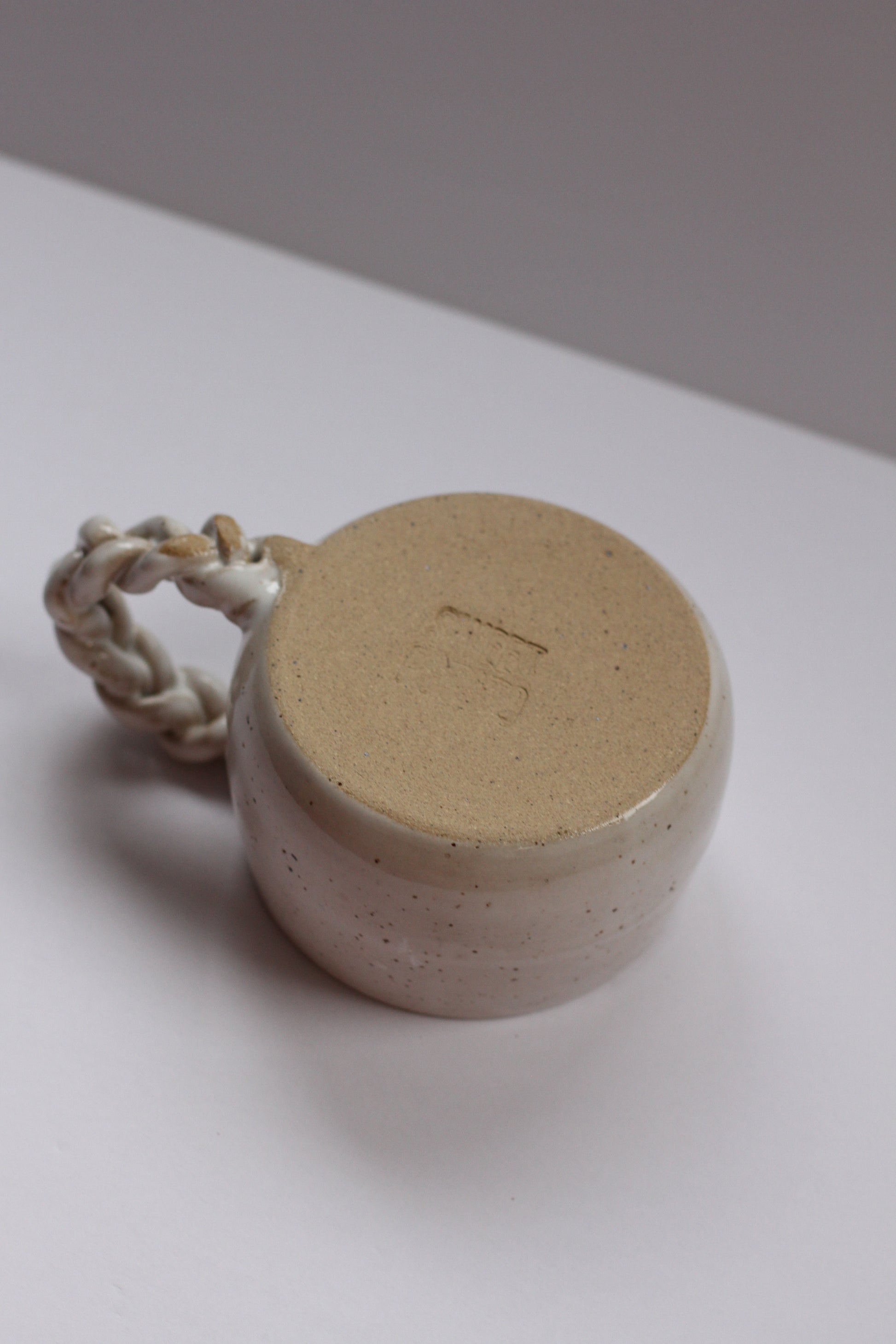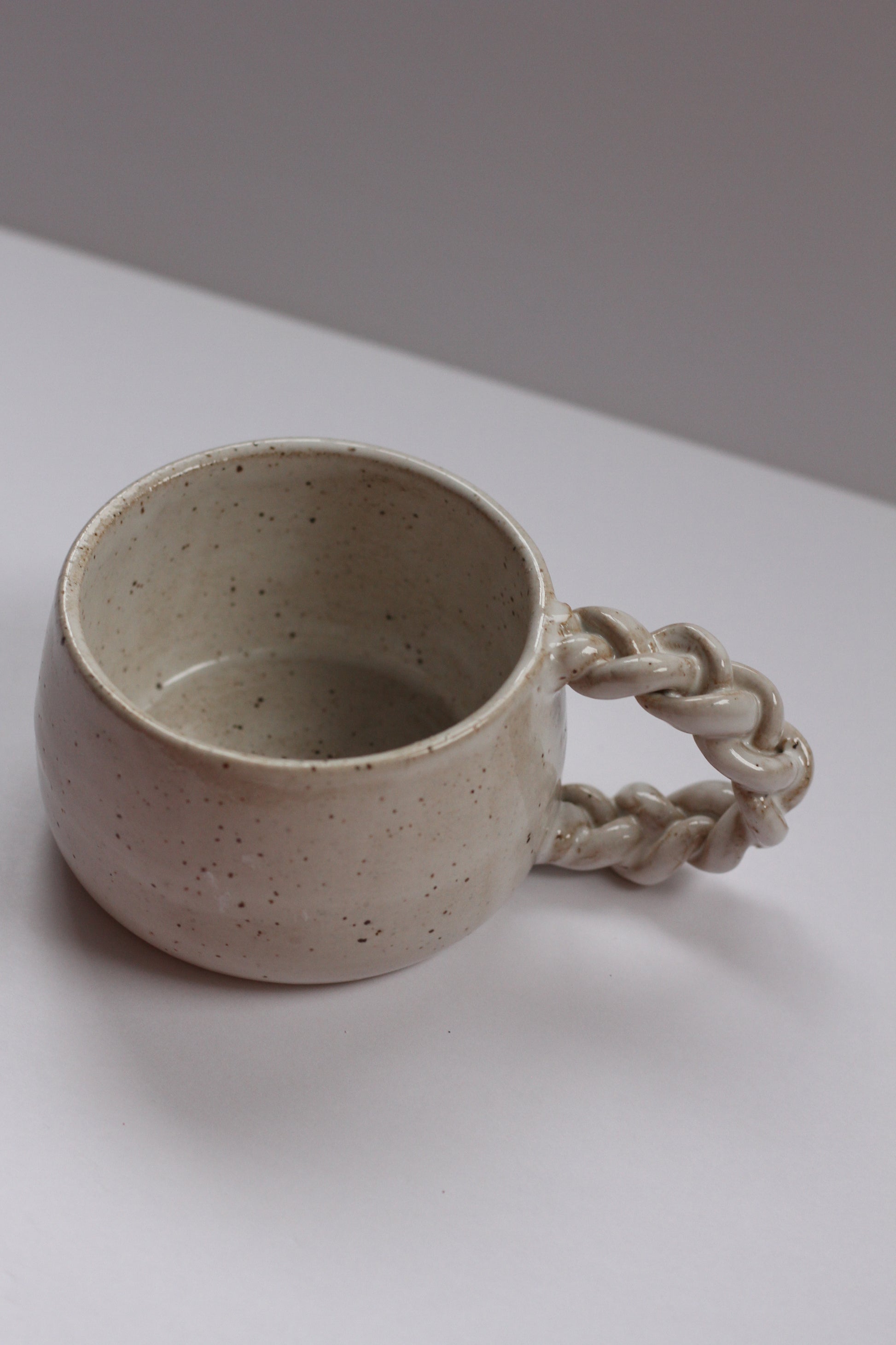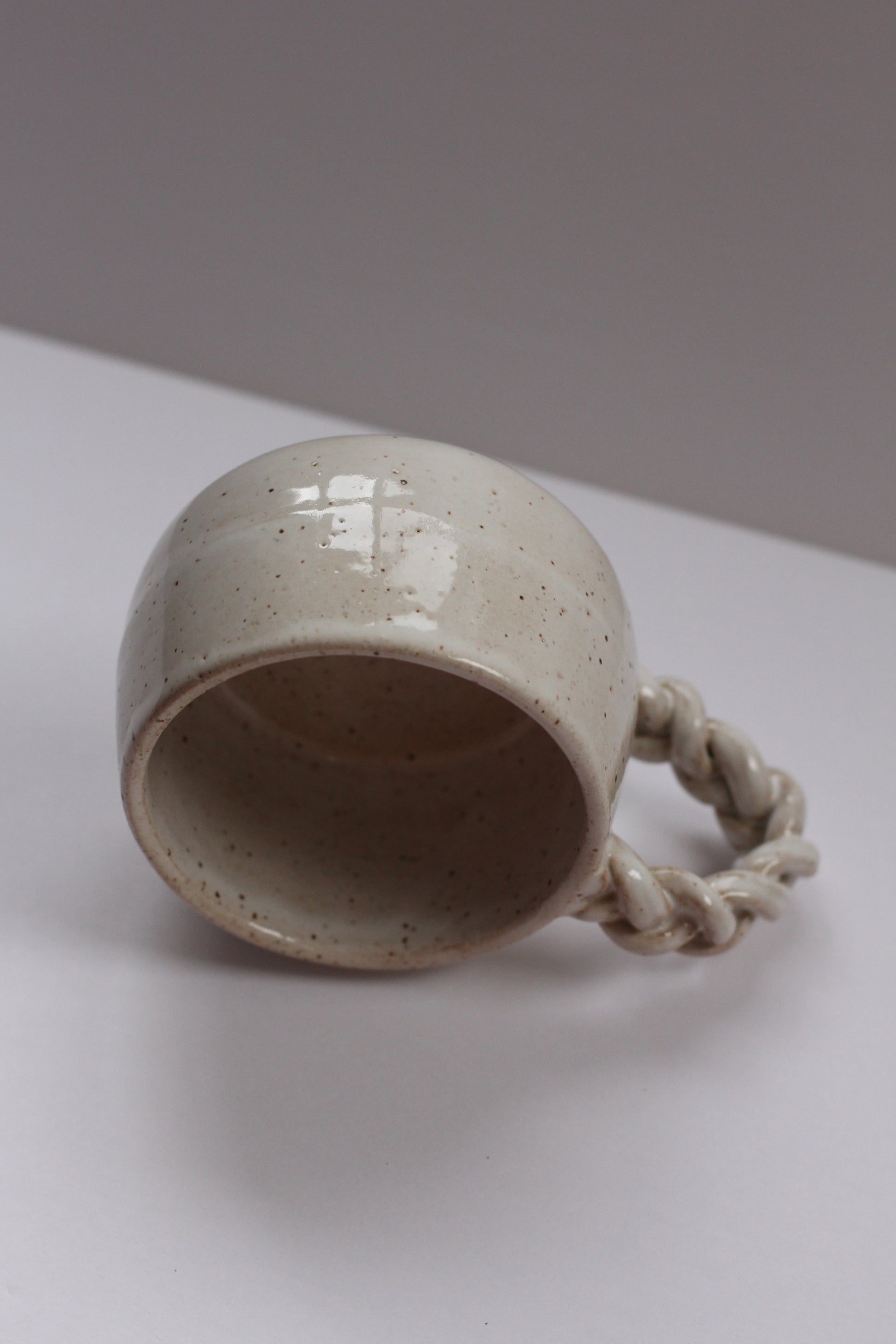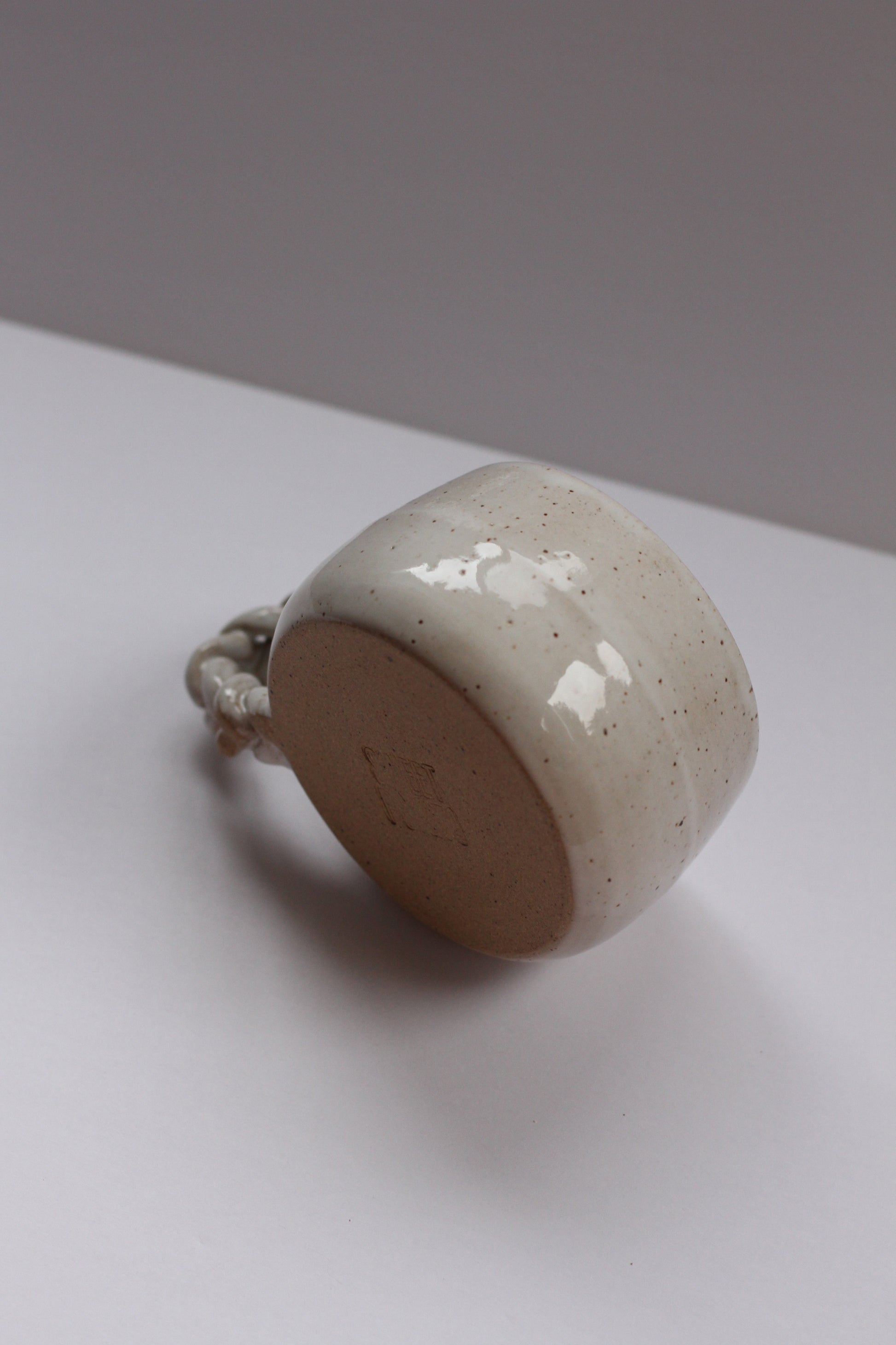 - Mug made with speckled stoneware clay. Shiny white glaze on the interior and exterior